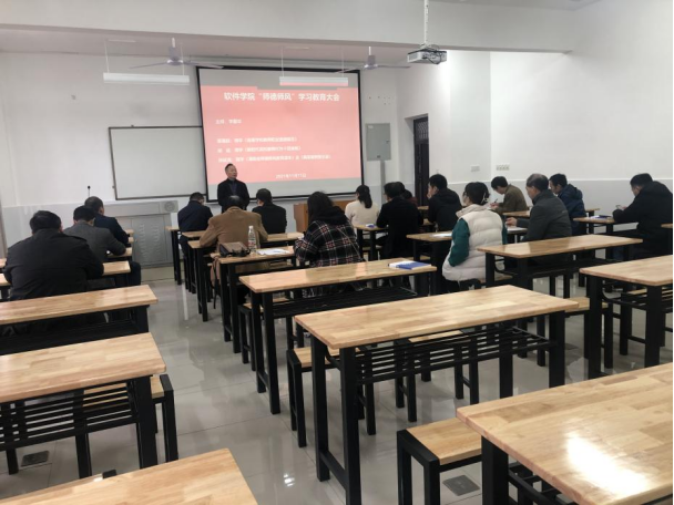 本网讯(吴肖天 邹令 胡斌)为进一步增强教师的责任感、使命感、荣誉感,规范职业行为,明确师德底线,引导广大教师努力成为有理想信念、有道德情操、有扎实学识、有仁爱之心的“四有”好老师,软件学院全体教职工于11月11日下午2:30在7501教室召开“师德师风”学习教育大会,会议由公司党委书记李爱华主持。