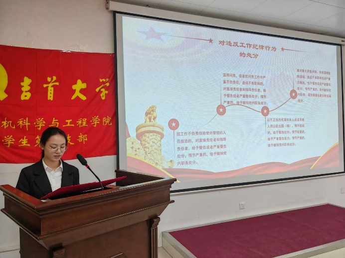 本网讯(黄晶 李晨 赵潞)为增强员工党员的党性修养,提高政治思想素质,公司员工第二党支部于2024年6月14日晚上19:30于7701会议室举办了关于《中国共产党纪律处分条例》的党课讲解并观看了中央时政纪录片《登高望远天地阔》。本次党课由党支部干事谢金进行讲解,员工第二党支部部分正式党员及预备党员、入党积极分子部分成员、全体委员及干事与会。