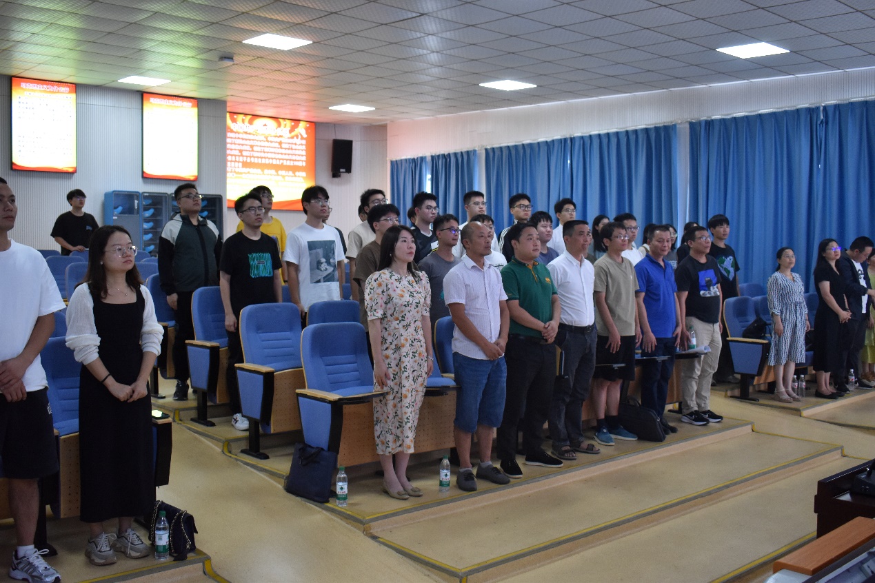 图为全体师生起立,奏唱国歌