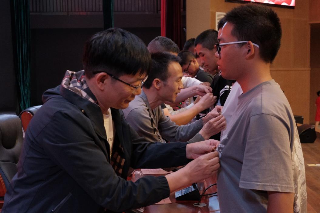 图为学院领导为新生代表佩戴校徽