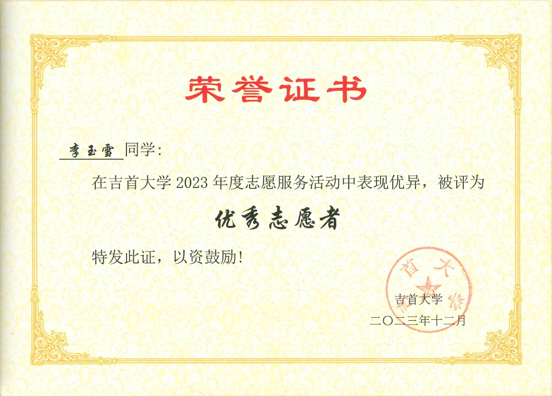 图为李玉雪优秀志愿者证书